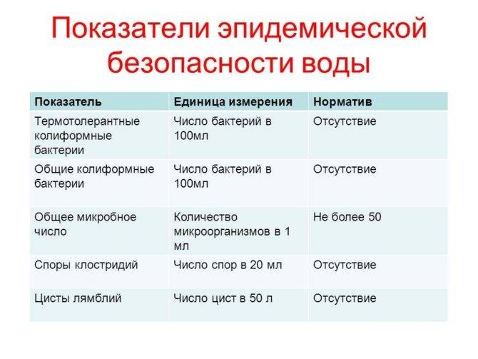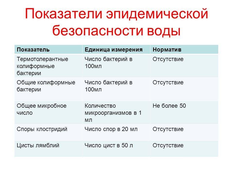Безопасность воды определяется по отсутствию в ней патогенных микроорганизмов. К сожалению, методика контроля эпидемических показателей сложна. Поэтому исследования проводят только при условии, что подозревается вспышка инфекционного заболевания, которое передается через воду, или создается другая неблагоприятная обстановка. Когда считается, что опасности нет, эпидемическая безопасность контролируется косвенно – по общему микробному числу и содержанию санитарно-показательных микроорганизмов.