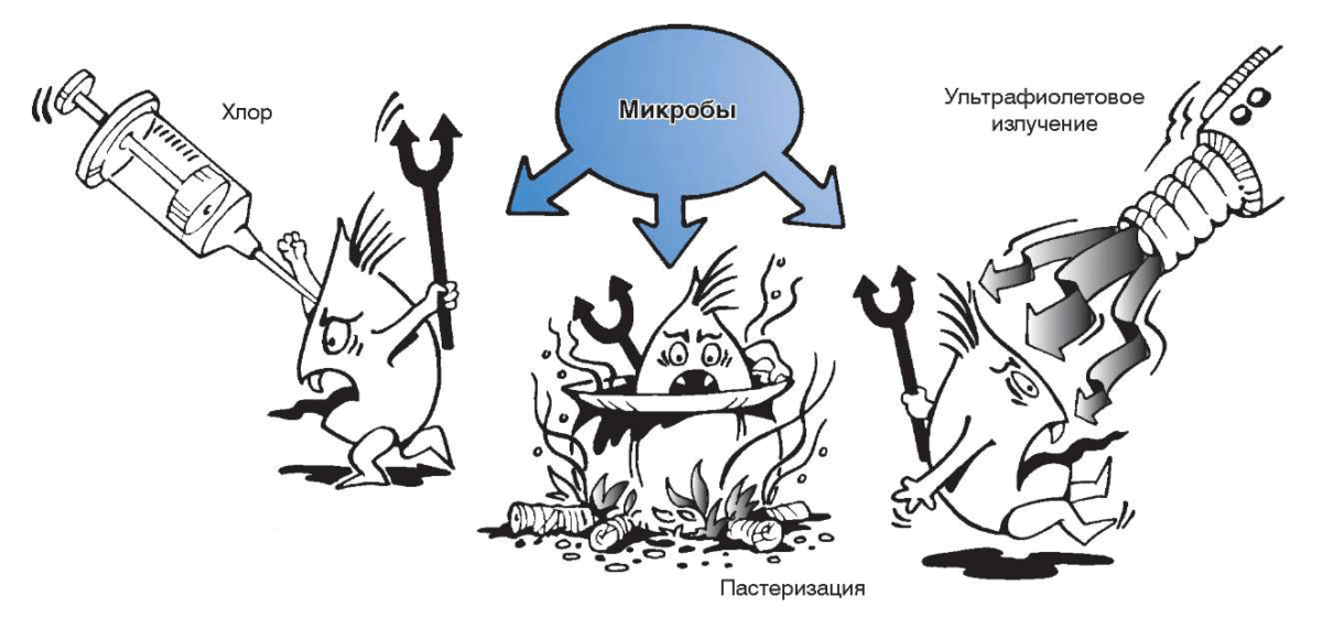 Особую опасность представляют собой болезнетворные бактерии, которые развиваются в таких условиях и представляют собой опасность для потребителей. Среди них возбудители холеры, тифа, дизентерии и многих других опасных заболеваний. Чтобы не допустить попадания вирусов в дома и квартиры, воду обеззараживают. Единственным способом, который сохраняет свою эффективность на протяжении всей длины трубопровода, является добавление в воду хлора. Кроме того, хлорирование – это достаточно дешевый метод. Он активно применяется по всему миру: в США, Англии и Испании. Объем добавляемого реагента и регулярность подачи описывается в специальных требованиях.