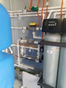 Первая ступень фильтрования проводит осветляющее фильтрование и частично обезжелезивание, промывается обратной промывкой, вторая ступень фильтрования осуществляет доокисление железа и марганца, регенерируется раствором перманганата калия KMnO4. Для перекрытия подачи в емкость неочищенной воды на период регенерации, установлен клапан с электроприводом. После фильтров I и II ступеней вода проходит через III ступень — ионообменный фильтр для снижения жесткости воды, регенерация ионообменного фильтра проводится солевым раствором. Все фильтры работают под управлением автоматических клапанов. Очищенная вода поступает в ёмкость запаса очищенной воды, которая служит для хранения запаса воды и обеспечения пиковых расходов.
