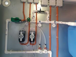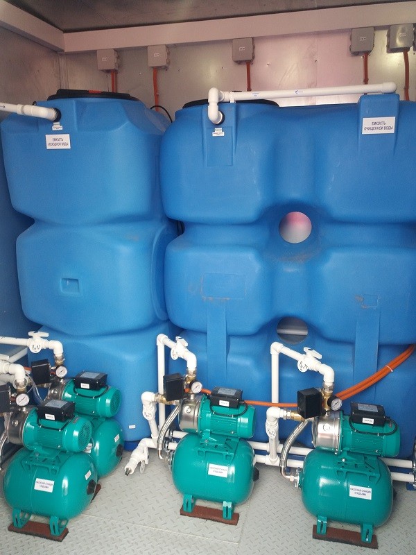 После накопительной емкости установлены насосы II подъема (рабочий + резервный), которые служит для подачи воды на промывку фильтров и обеспечения напора воды на выходе станции очистки. Для улавливания механических частиц на выходе установлен фильтр тонкой очистки с рейтингом фильтрации 5 мкм. Очищенная вода перед подачей в сеть потребителя проходит обеззараживание на ультрафиолетовом стерилизаторе.