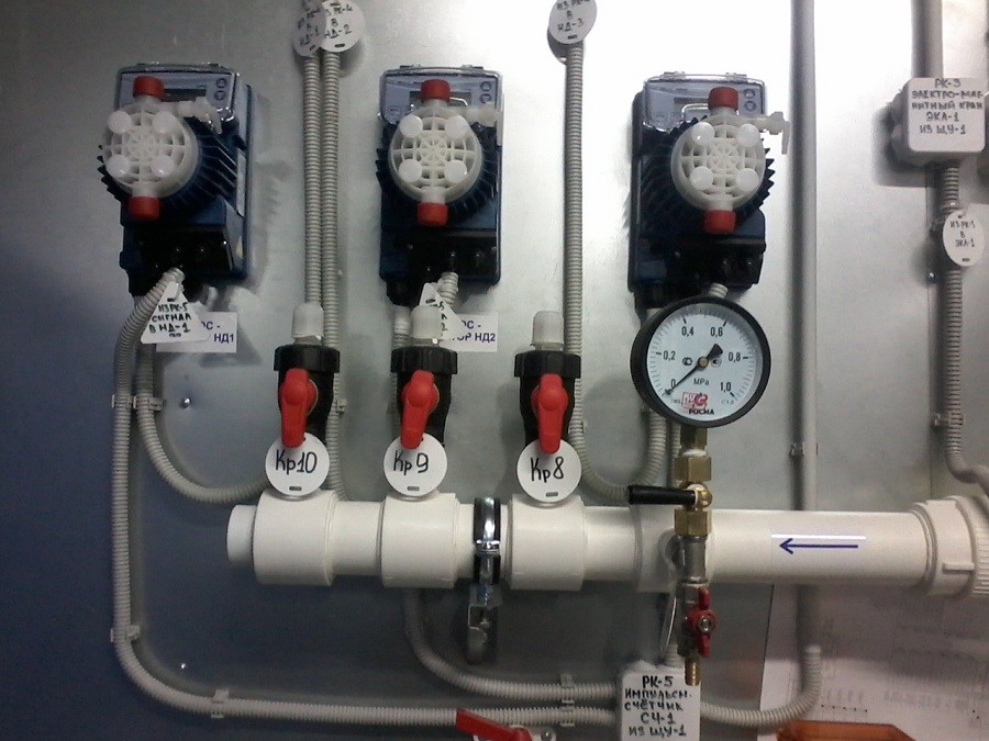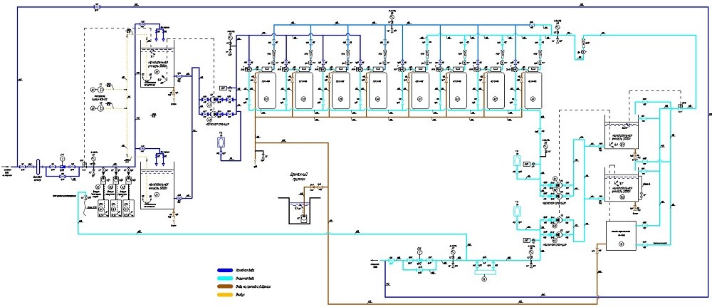 Далее в очищаемую воду дозируются растворы гипохлорита натрия, коагулянта и корректора рН. Все реагенты дозируются химнасосами-дозаторами пропорционально расходу воды. Для обеспечения времени контакта реагентов с водой предусмотрены резервуары исходной воды РИВ. Для более интенсивного перемешивания и насыщения воды кислородом воздуха РИВ оборудованы дисковыми аэраторами, к которым компрессорами подается воздух. Также в РИВ предусмотрены спиральные форсунки для более эффективного контакта воды и воздуха.