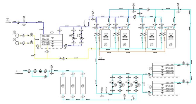 Принципиальная технологическая схема очистки воды выглядит следующим образом. Исходная вода из скважины подается в окислительную емкость. В трубопровод исходной воды перед емкостью в воду вводится воздух для окисления соединений железа Fe2+. Подача воздуха осуществляется в автоматическом режиме компрессорами. Далее вода из емкости насосами НС I-го подъема подается на блок фильтрации. Данная ступень предназначена для осветления воды, удаления хлопьев образовавшихся окислов железа. Блок фильтрации состоит из 4-х фильтров с автоматическими клапанами управления. Обвязка трубопроводов выполнена таким образом, что фильтры могут работать как в одну ступень, так и в 2 ступени (по 2 фильтра в каждой).