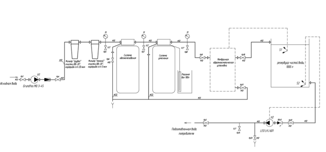 Задача объекта: очистка хозяйственно-питьевой привозной воды из любого источника, отбор – из резервуара чистой воды