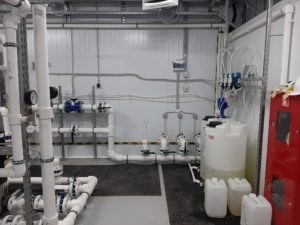 При приготовлении раствора коагулянта используются электромешалки. Ввод коагулянта осуществляется в 2-х точках – перед установкой аэрации и при обработке промывных вод. Для приготовления и хранения используемых реагентов предусмотрено реагентное хозяйство внутри помещения ВОС.