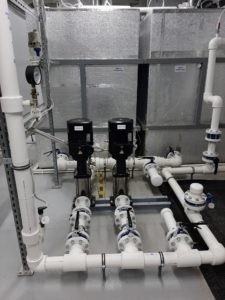 Принципиальная схема водоснабжения выглядит следующим образом. Исходная вода от скважин насосами первого подъема через узел учета поступает на установку аэрации воды подается на станцию. Предварительно перед установкой в воду подаются посредством насосов-дозаторов растворы коагулянта и гипохлорита натрия для окисления различных соединений, содержащихся в воде, а также для обеспечения надлежащего санитарно-эпидемиологического состояния СОВ. Реагенты дозируются насосами пропорционального типа по сигналам от импульсного счетчика. Установка аэрации оборудована воздушными патрубками, каплеуловителями, форсунками. Подача воздуха в установку осуществляется от вентилятора. Забор воздуха – из окружающей среды.