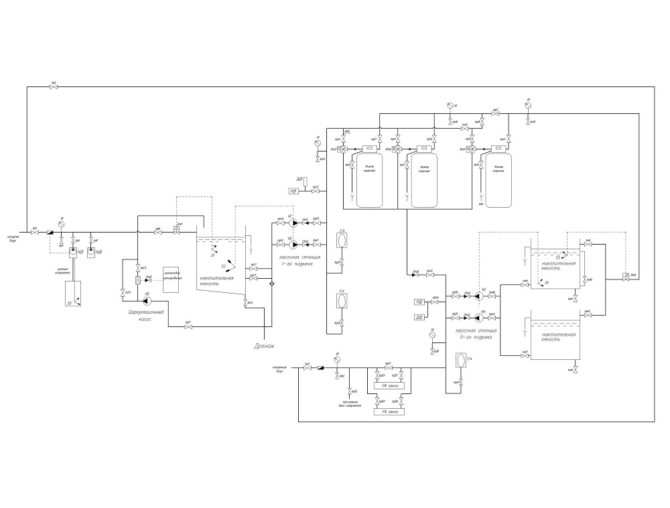 Затем из емкости исходной воды насосной станцией I -го подъема вода подается на очистку. Основная очистка осуществляется на блоке фильтрации. Блок состоит из 3-х параллельно работающих скорых фильтров. Именно эта ступень обеспечивает снижение концентрации окисленных загрязнений, удаление механических примесей, взвесей, осветление и снижение цветности воды.