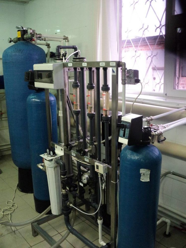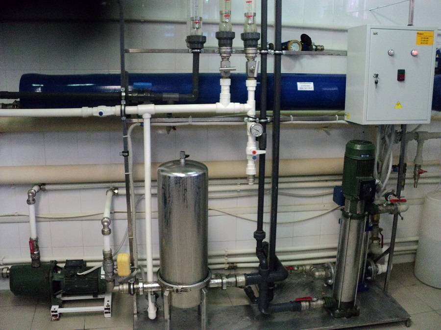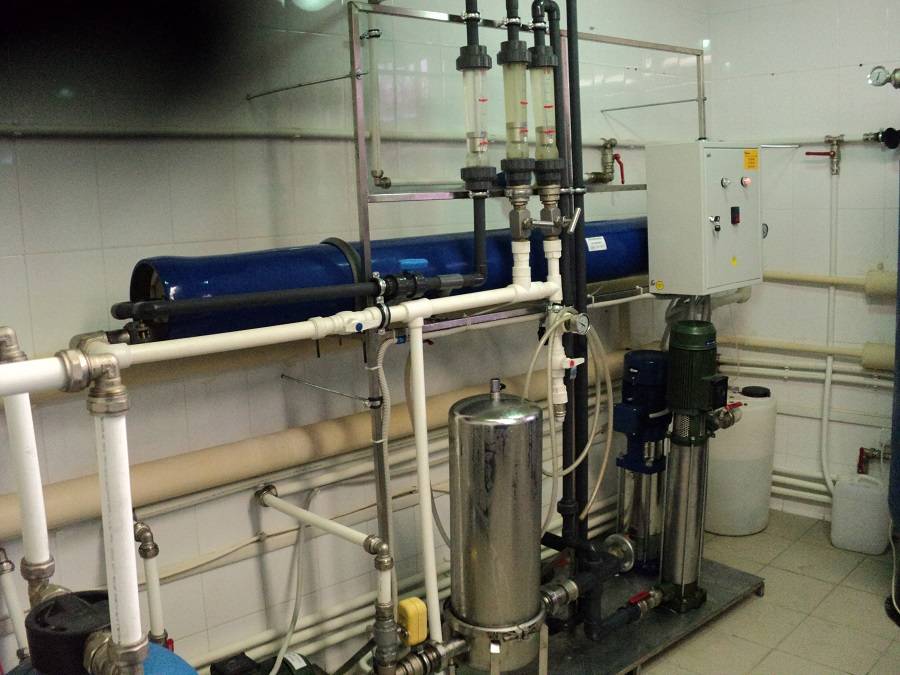 Исходная вода через системы механической очистки накапливается в емкость исходной воды. Оттуда при помощи насосов подается на установки дехлорирования и далее-на мембранные обратноосмотические установки.