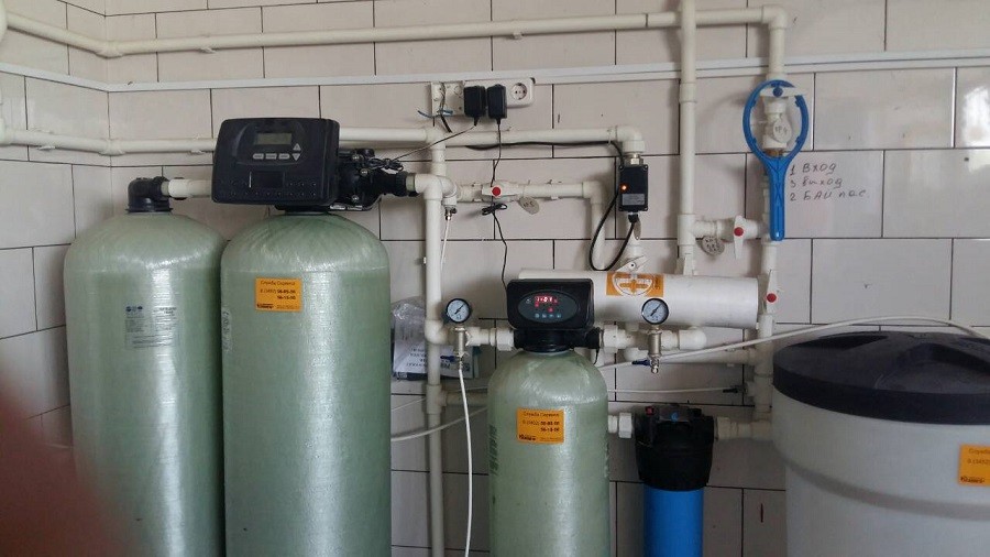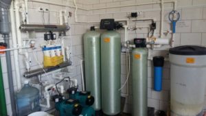 Исходная вода из скважины скважинным насосом подается сначала на систему фильтрации для механической очистки, а затем – на ионообменную систему непрерывного действия. На этой ступени осуществляется корректировка содержания в воде солей жесткости, общего железа, марганца, иона аммония.