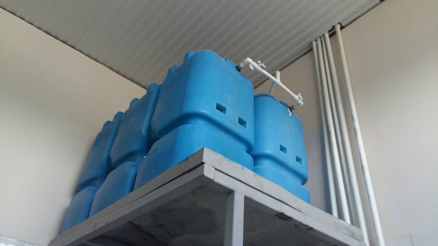 Затем очищенная вода накапливается в резервуарах чистой воды (РЧВ), а оттуда при помощи насосной станции через системы УФ обеззараживания подается потребителю. Для экономии площади помещения РЧВ размещены на подставках на высоте 2,5 м.