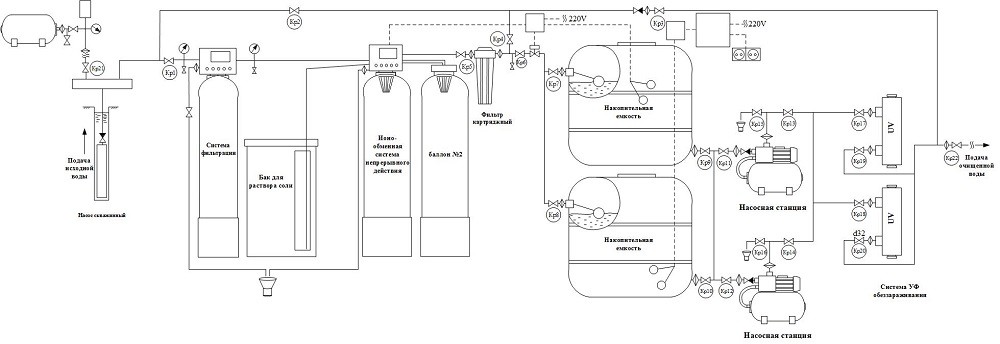 Принципиальная схема системы очистки воды: