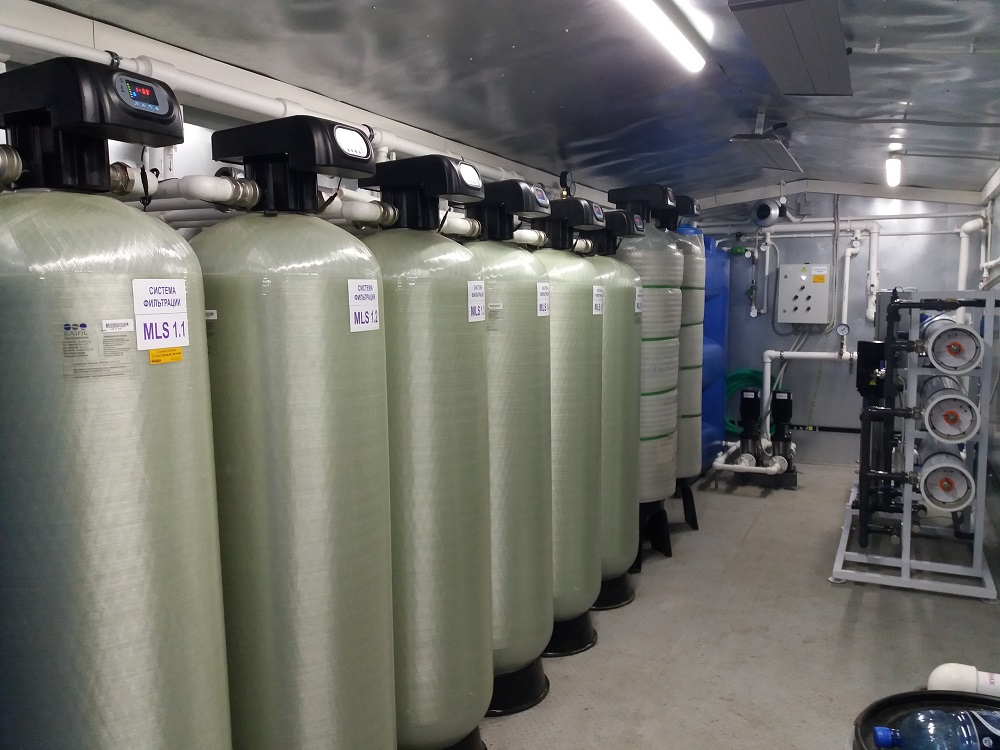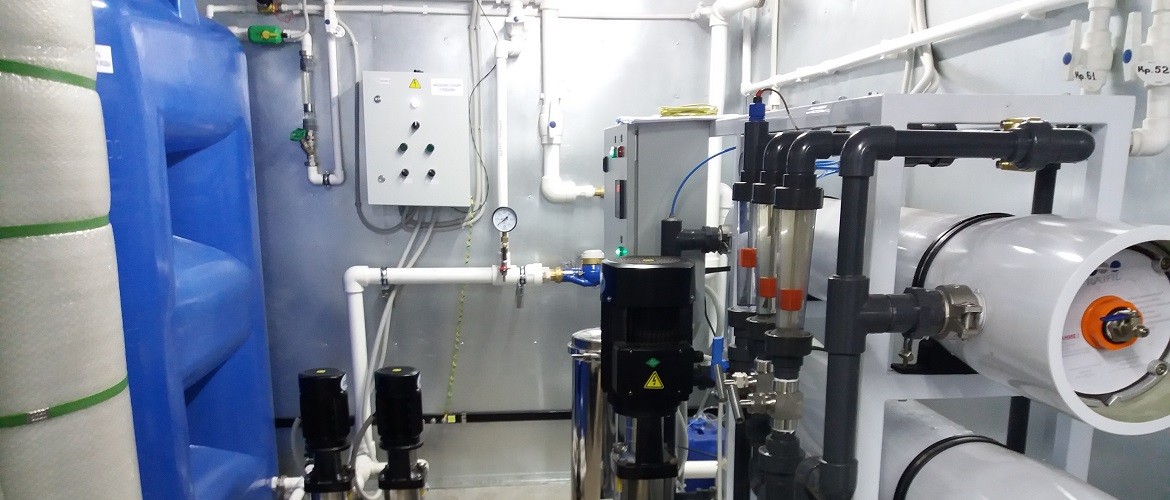Далее часть расхода воды для снижения общего солесодержания подается на мембранную обратноосмотическую установку. Для защиты мембранных элементов от отложения солей предусмотрено дозирование раствора антискаланта. Дозирование осуществляется в автоматическом режиме.