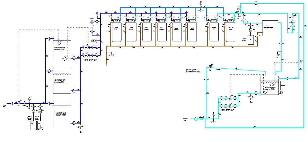 Принципиальная технологическая схема очистки воды выглядит следующим образом. Исходная вода из скважины подается в емкости исходной воды. Емкости оборудованы автоматикой уровней. В трубопровод исходной воды перед емкостями дозируются растворы гипохлорита натрия и щелочи для более эффективного окисления различных примесей. Дозирование осуществляется в автоматическом режиме химнасосами-дозаторами. Далее из емкостей насосной станцией I-го подъема вода подается на блок фильтрации. Данная ступень предназначена для осветления воды, удаления хлопьев образовавшихся загрязнений. Блок фильтрации состоит из 6-ти параллельно работающих фильтров-осветлителей с автоматическими клапанами управления.