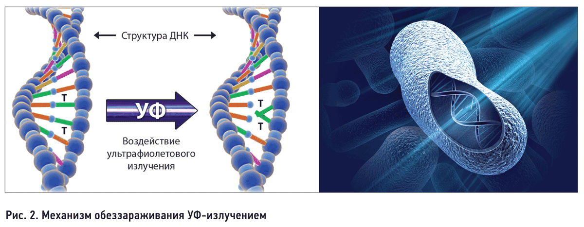 Дезинфицирующее действие ультрафиолетового излучения известно очень давно. Его работа сходна с солнечным светом, успешно уничтожающим неприспособленные микроорганизмы за пределами озонового слоя Земли. Ультрафиолет воздействует на клетки, создавая поперечные сшивки в ДНК, вследствие чего клетка теряет возможность делиться и погибает (Рис. 2).