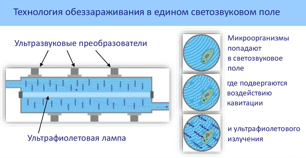 Работа таких установок основана на кавитации. Из-за интенсивных колебаний, которым подвергается вода благодаря высокочастотному звуку, в жидкости образуются многочисленные пустоты, она будто «вскипает». Мгновенный перепад давлений приводит к разрыву клеточных оболочек и гибели микроорганизмов.