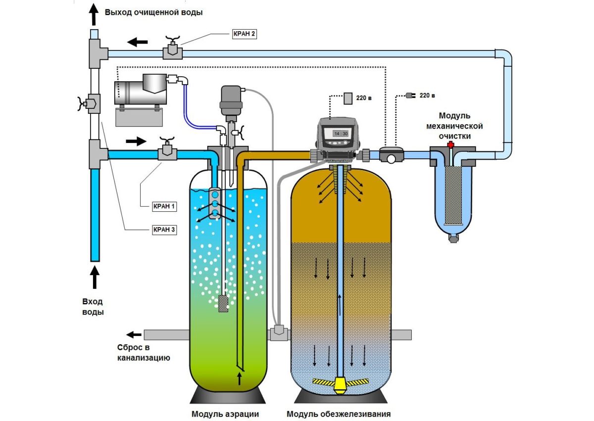 На основе результатов исследования специалисты выполняют сборку водоочистной системы. При повышенном содержании химического элемента используются установки с аэрированием. Если жидкость обогащена солями жесткости, необходимы комплексные засыпки со смолами. При большом количестве загрязнений потребуется многоуровневая установка.