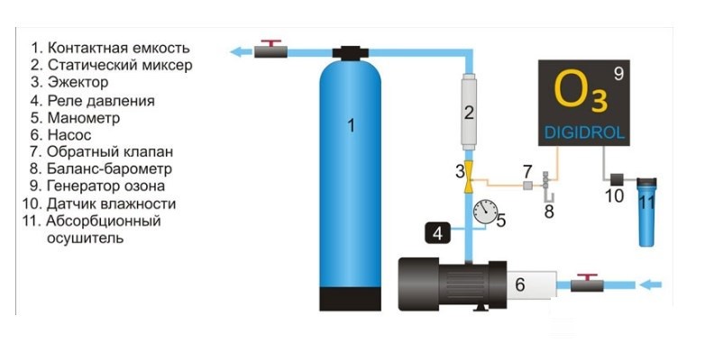 Такие системы позволяют эффективно убрать примеси железа в воде с помощью озона, который более эффективно окисляет химический элемент, чем 2-валентная форма.
