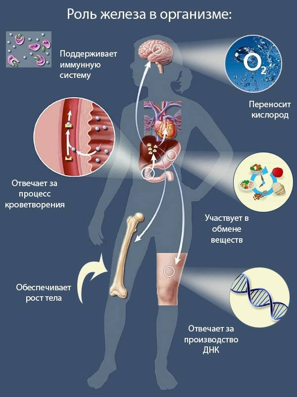 Мы все содержим от 2,5 до 4,5 мг железа. Этот микроэлемент необходим для нормального дыхания. Он входит в состав гемоглобина, транспортирующего кислород к нашим органам и тканям. Железосодержащие соединения участвуют и в других процессах, например: