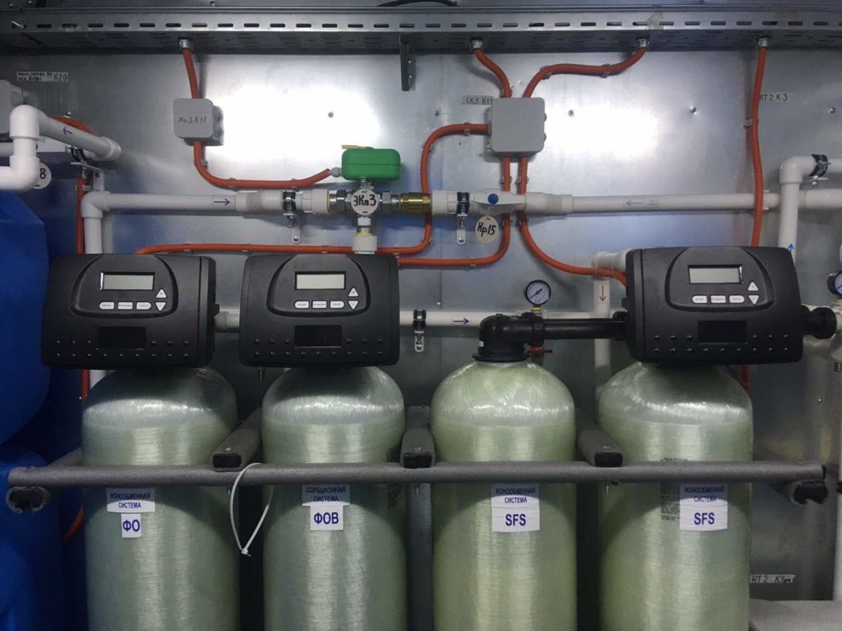 После фильтров осветления и обезжелезивания вода проходит через фильтр умягчения для снижения содержания солей жесткости и затем накапливается в емкости чистой воды.