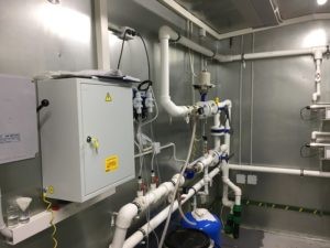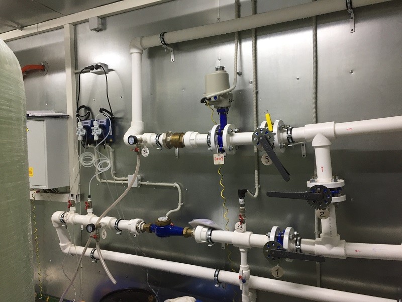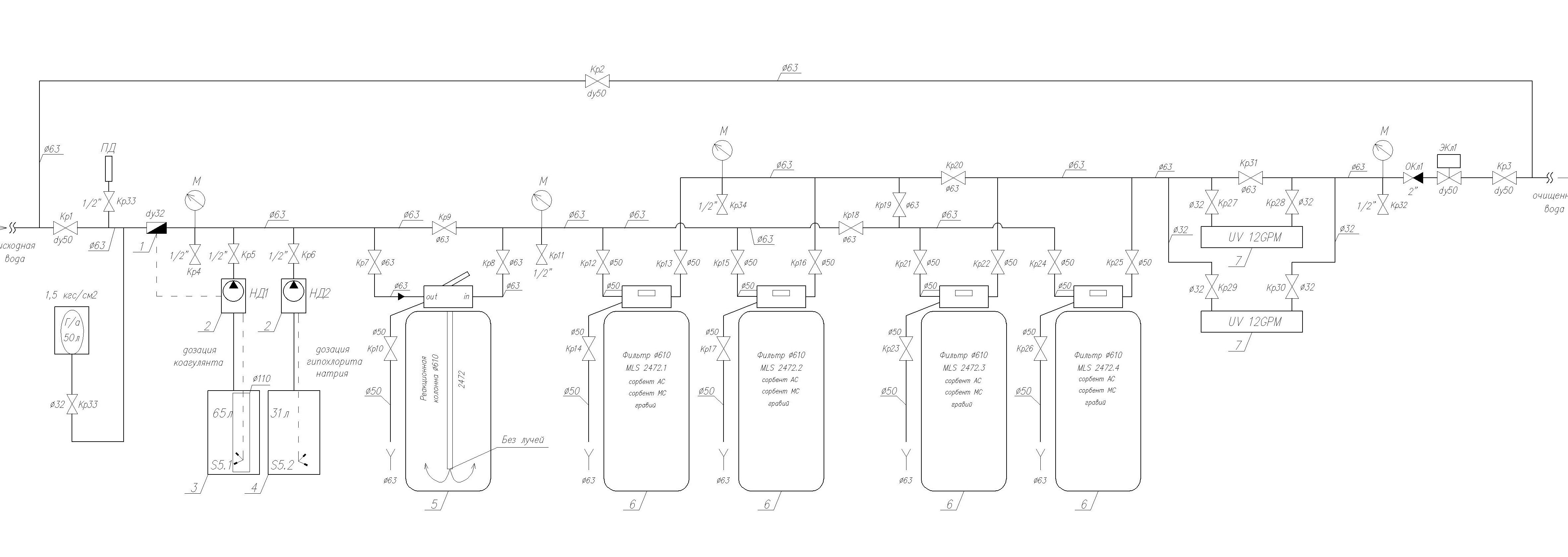 Принципиальная технологическая схема очистки воды выглядит следующим образом. Исходная вода из скважин подается на очистку. По сигналу от импульсного счетчика пропорционально расходу воды дозируются растворы щелочи (NaOH) и гипохлорита натрия (NaClO). Для обеспечения времени контакта обрабатываемой воды с реагентами предусмотрена реакционная колонна. Затем вода направляется на блок фильтрации. Данная ступень предназначена для осветления воды, удаления окисленных форм загрязняющих веществ. Блок фильтрации состоит из 4-х параллельно работающих фильтров с автоматическими клапанами управления. Также возможна работа фильтров в 2 ступени: два фильтра – I ступень, два фильтра -II ступень.