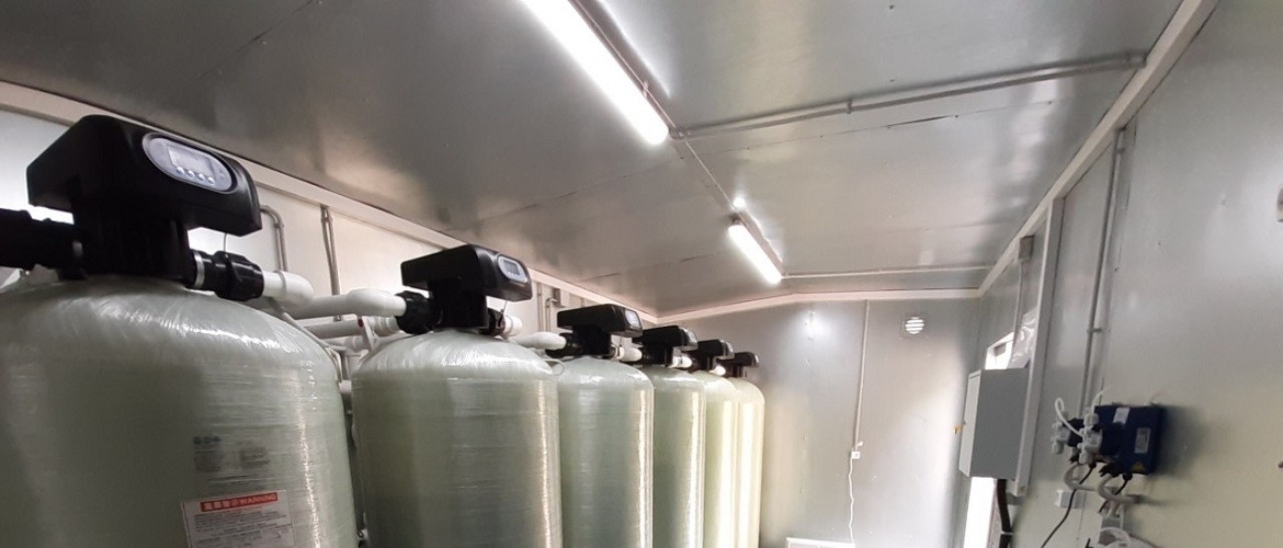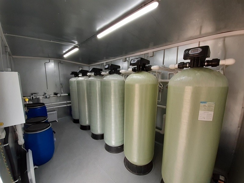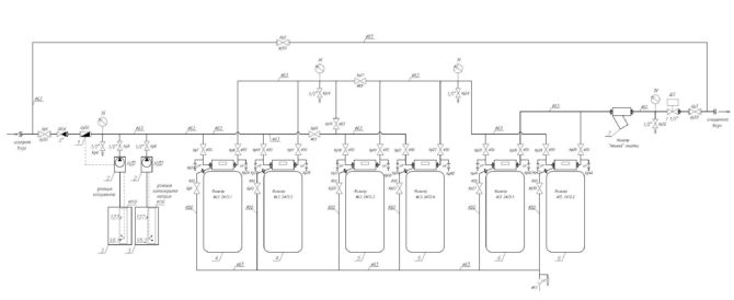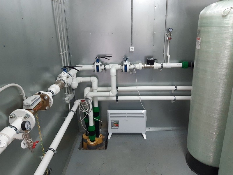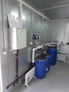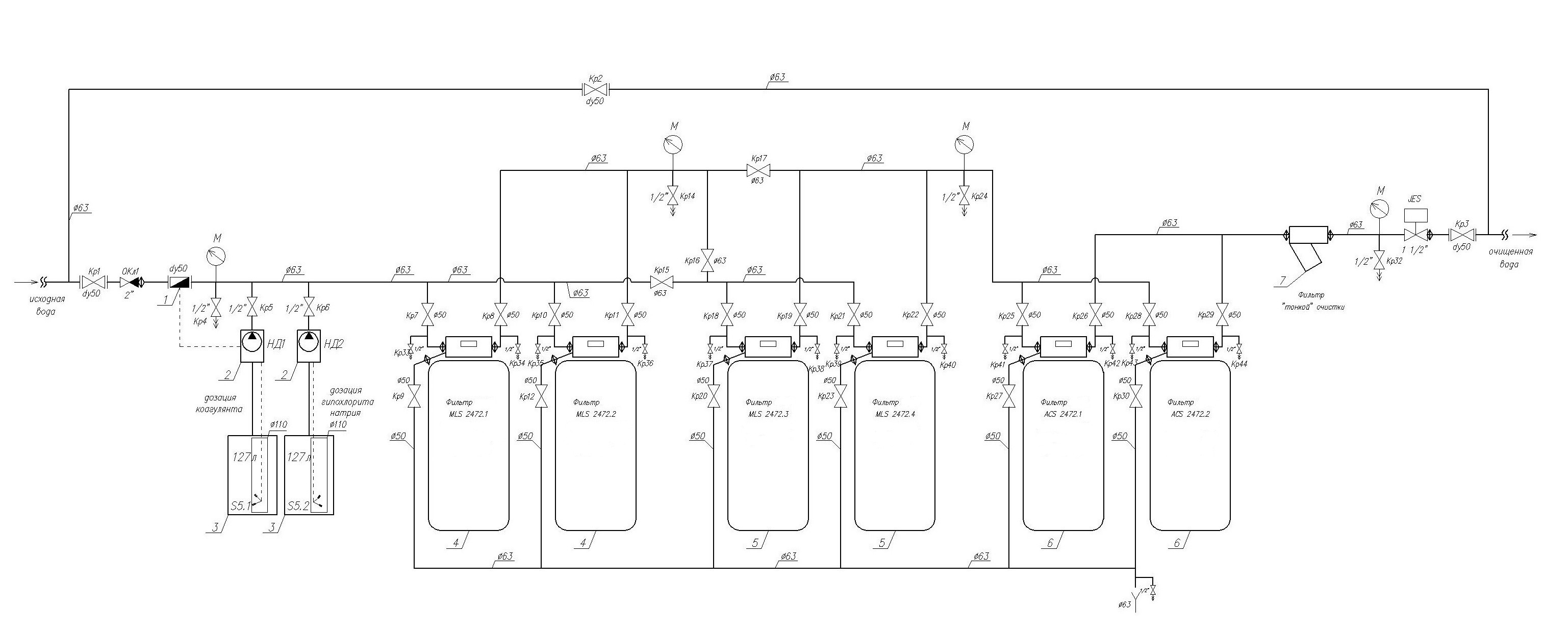 Исходная вода из скважины подается на очистку. По сигналу от импульсного счетчика пропорционально расходу воды дозируются растворы коагулянта и гипохлорита натрия. Затем вода направляется на блок фильтрации 1-й ступени. Данная ступень предназначена для первичного осветления воды, удаления хлопьев образовавшихся загрязнений, частичного снижения концентраций железа и марганца. Блок фильтрации 1-й ступени состоит из 2-х параллельно работающих фильтров (систем) с автоматическими клапанами управления. Далее вода подается на 2-ю ступень фильтрации, которая также состоит из 2-х параллельно работающих фильтров (систем). Эта ступень предназначена для более эффективного осветления воды, а также для гарантированного снижения концентрации ионов аммония. Для улучшения органолептических качеств питьевой воды предусмотрен блок сорбционной очистки (состоит также из 2-х параллельно работающих фильтров-систем).