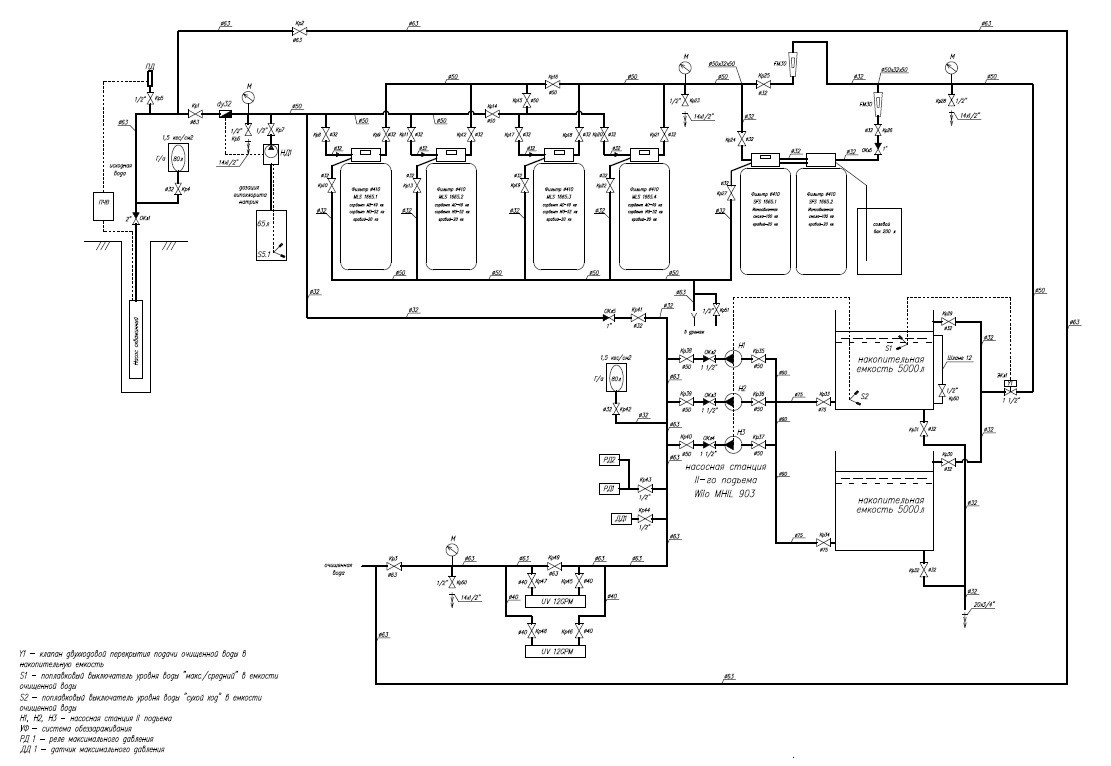 Исходная вода из скважин подается на очистку. По сигналу от импульсного счетчика пропорционально расходу воды дозируется раствор гипохлорита натрия. Затем вода направляется на блок фильтрации. Данная ступень предназначена для осветления воды, удаления хлопьев образовавшихся загрязнений. Блок фильтрации состоит из 4-х параллельно работающих фильтров с автоматическими клапанами управления. Затем часть расхода воды для снижения общей жесткости направляется на ионообменную установку непрерывного действия.