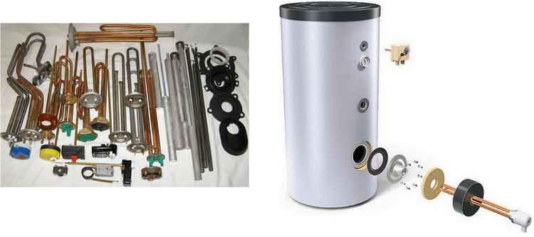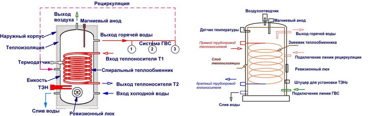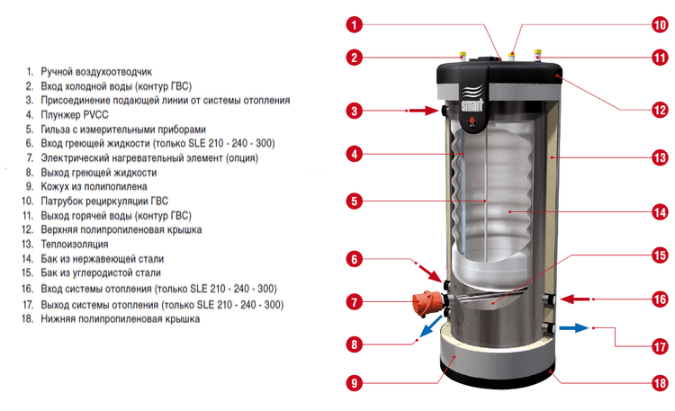 Снаружи на корпусе устанавливаются патрубки для подключения труб подвода и отвода воды, датчиков давления и температуры, смотровые люки. Внутри него находятся 1 или 2 водонагревателя в виде змеевика. По спиральной трубке бежит горячая вода от подключенного к системе работающего источника тепла — автономного отопительного котла, электронагревателя, солнечного коллектора, теплового насоса.