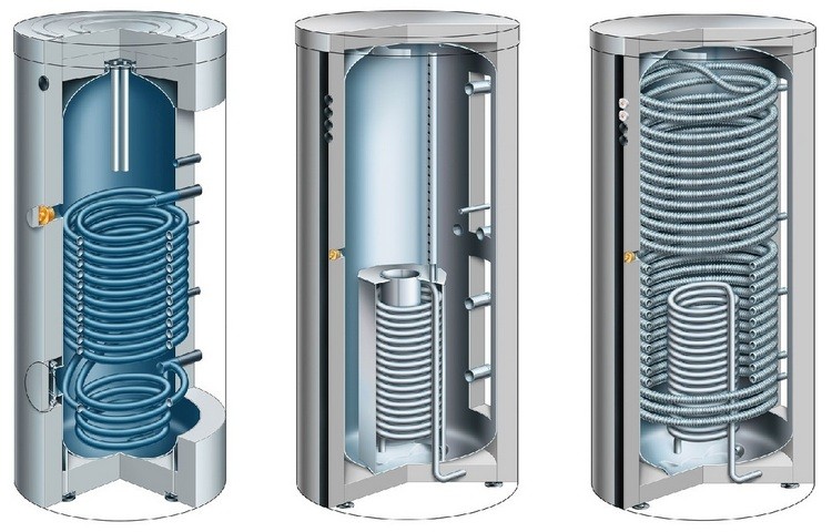 Разные фирмы производят различные по конструкции и размерам модели бойлеров. Есть устройства, имеющие несколько змеевиков. Их можно подключать сразу к нескольким источникам тепла. Есть варианты, имеющие несколько точек отбора горячей воды.