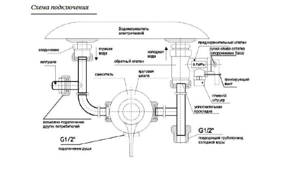 - Присоединить к водоснабжению. Трубы, клапаны и фитинги монтируются по схеме подключения, приведенной в инструкции по эксплуатации. Все резьбовые соединения следует уплотнить и загерметизировать.