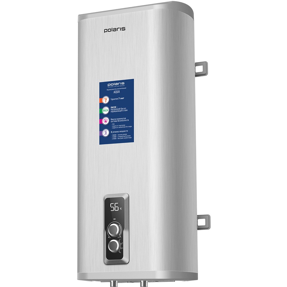 - Polaris Vega SLR 80V. Устройство имеет стильный серебристый корпус, мощность нагревателя составляет 2,5 кВт. Цифровой дисплей отображает точные показатели, внутри размещены 2 бака из нержавеющей стали, что замедляет смешивание нагретой и холодной воды. К минусам модели относят крупные габариты и отсутствие функции ускоренного нагрева.