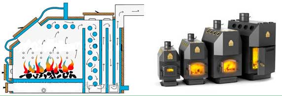 Устройство состоит из 2 отсеков: верхнего и нижнего. В один закладываются и разжигаются дрова или уголь. Второй служит емкостью для воды. Также есть дымоход диаметром около 110 см. Получается, что жидкость греется от дыма, металла и горения топлива.