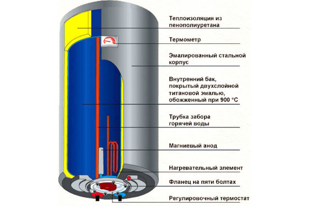 Внутренний резервуар всегда представляет собой цилиндр. Это необходимо для равномерного распределения давления, возникающего при нагреве воды, на стенки бака.