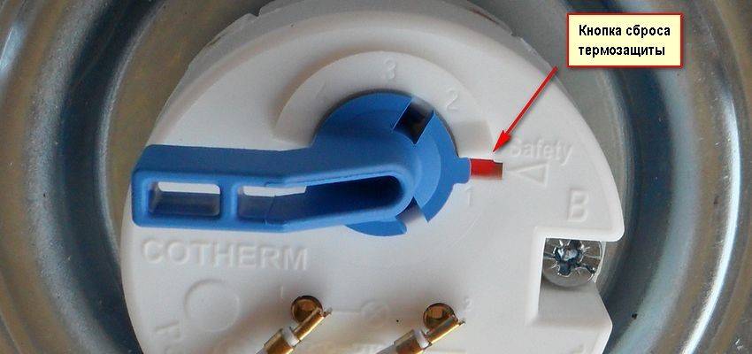- Возможно, включился термостат. Необходимо включить кнопку теплозащиты, находящуюся у различных моделей в разных местах корпуса. К примеру, у водонагревателей «Термекс» кнопка располагается внизу бака и закрыта крышкой.